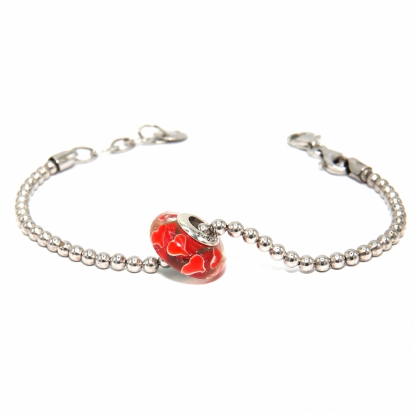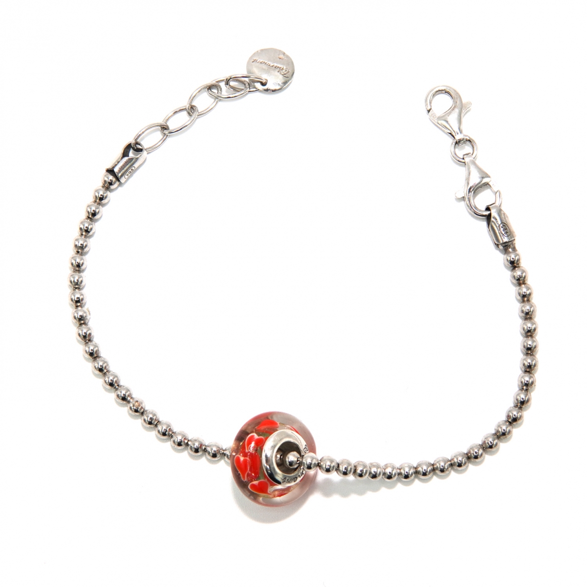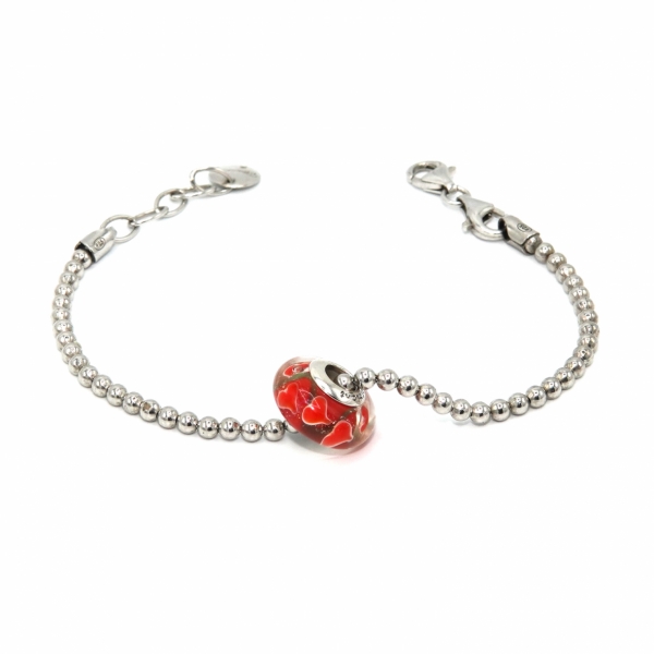 Bracciale argento 925 a palline. Lunghezza variabile da 18 cm. fino a 20 grazie alla presenza di anelline. Il ciondolo centrale è in argento con vetro di murano ed è in omaggio.