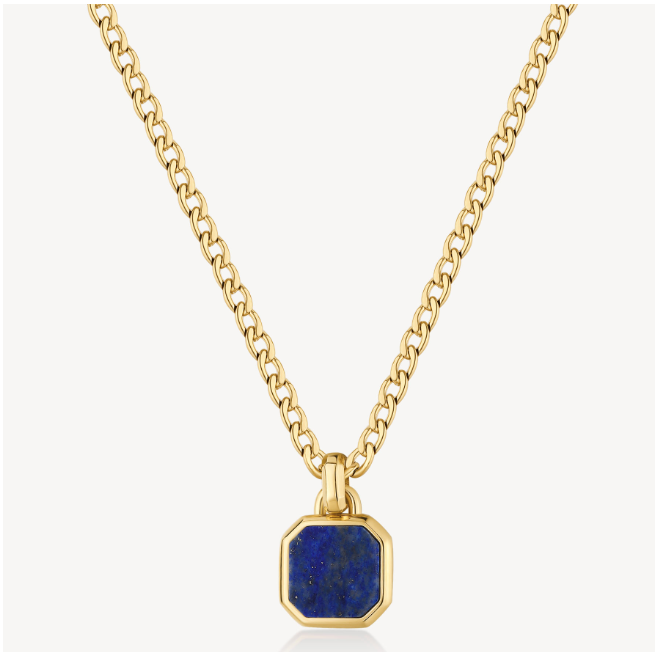 Collana catena grumetta girocollo in acciaio 316L e finitura pvd oro 14K con pendente con lapislazzuli.
