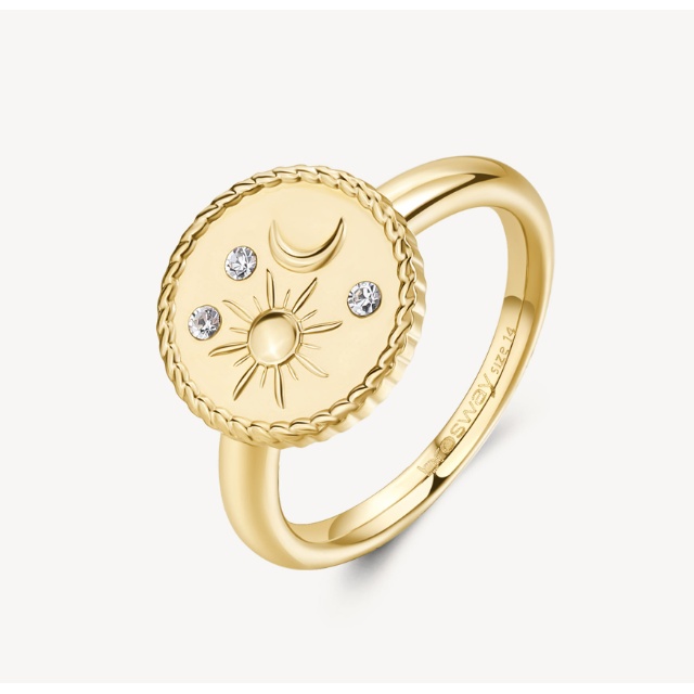 Anello sigillo in acciaio 316L e finitura pvd oro 14K con sole, luna e cristalli.