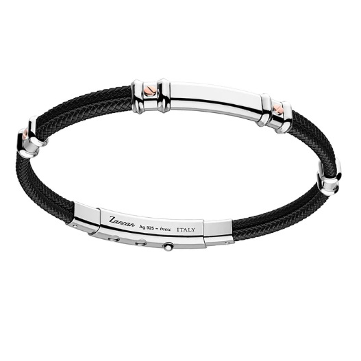 Bracciale della collezione Zancan Robikevlar Star da uomo. Colore: argento e nero. Il gioiello è in klevar nero composto da placca in argento 925‰ impreziosita da dettagli in oro rosa 750‰ (18kt) e da chiusura regolabile su tre posizioni in acciaio inossidabile 316L a scatto.