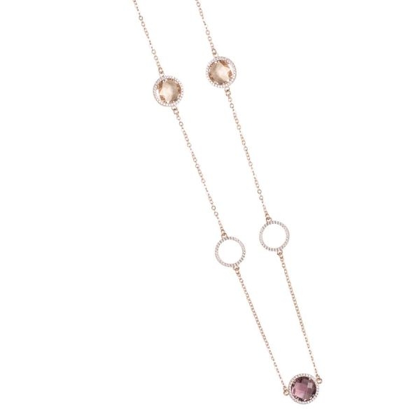 Collana monofilo in bronzo placcato oro rosa con cerchi in zirconi alternati a cristalli briolette peach e ametista con zirconi. Lunghezza cm 95.