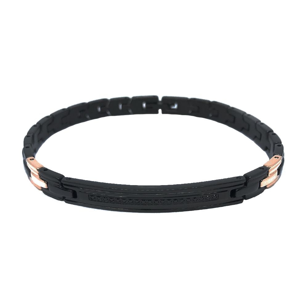 Bracciale Zancan collezione Hi Teck, in Acciaio con Trattamento in PVD Nero e Rose Gold impreziosito da Spinelli Neri. Lunghezza 21 cm.
