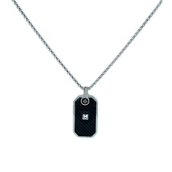 Collana con pendente della collezione Zancan Hi-Teck da uomo. Colore: argento e nero. Il gioiello è in acciaio inossidabile 316L con trattamento pvd nero impreziosito da uno zircone bianco. Lunghezza 50 cm con chiusura a moschettone.