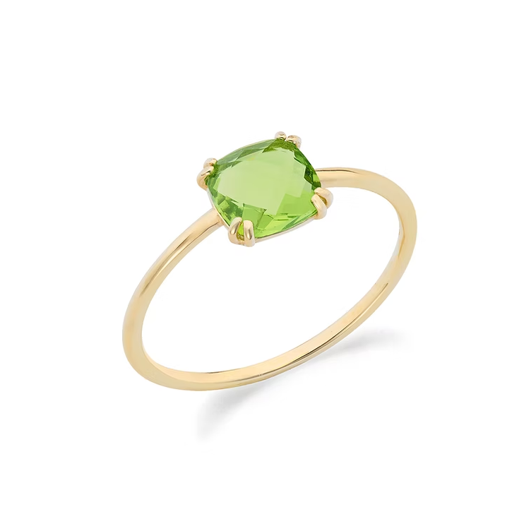 Un anello elegante e raffinato, realizzato in oro giallo 375‰ con un luminoso cristallo peridot dal taglio sfaccettato, incastonato a quattro griffe per esaltarne la brillantezza. Il design minimalista della montatura lo rende perfetto per essere indossato da solo o combinato con altri anelli per creare abbinamenti sofisticati e moderni. Made in Italy, è disponibile nella misura standard 13, un gioiello versatile che illumina ogni look con un tocco di colore.