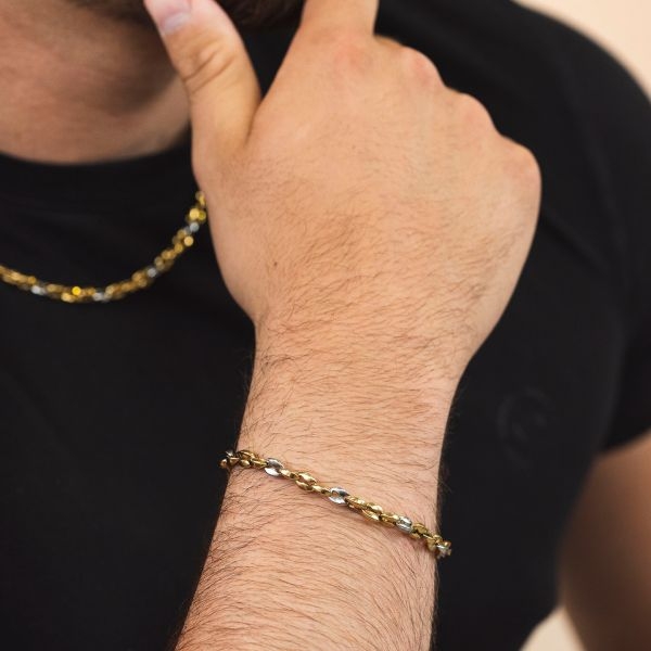 Bracciale in acciaio rodiato con catena a maglia marina piccola alternata tra moduli rodiati e placcati oro giallo.