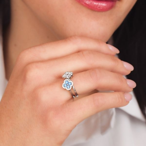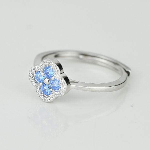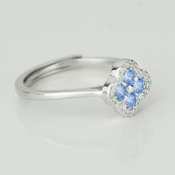 Anello regolabile in argento rodiato con quadrifoglio pendente in pavè di zirconi e cristalli acquamarina