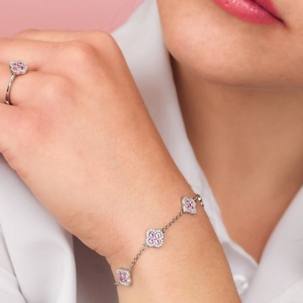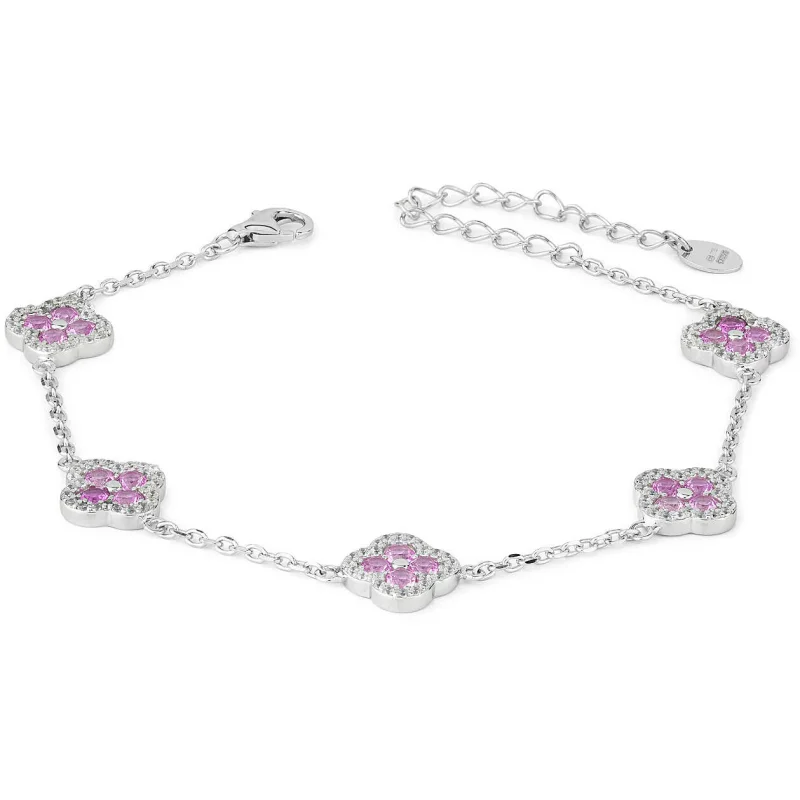 Bracciale in argento rodiato con 5 quadrifogli realizzati in pavè di zirconi e cristalli rosa. E' realizzato in argento rodiato e presenta un design raffinato con 5 quadrifogli decorati in pavè di zirconi e cristalli rosa. La lunghezza è di 17 cm, estendibile fino a 20 cm, con una chiusura a moschettone per una vestibilità sicura e confortevole. Questo gioiello, prodotto in Italia, è perfetto per aggiungere un tocco di eleganza e femminilità al tuo look quotidiano o per occasioni speciali.
