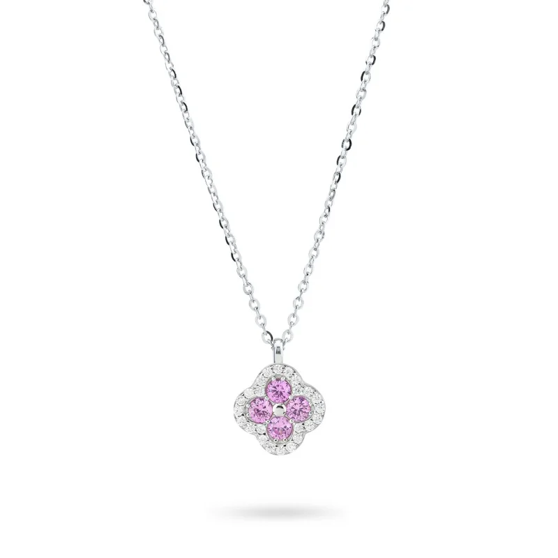Collana in argento rodiato con quadrifoglio pendente in pavè di zirconi e cristalli di colore bianco e rosa
