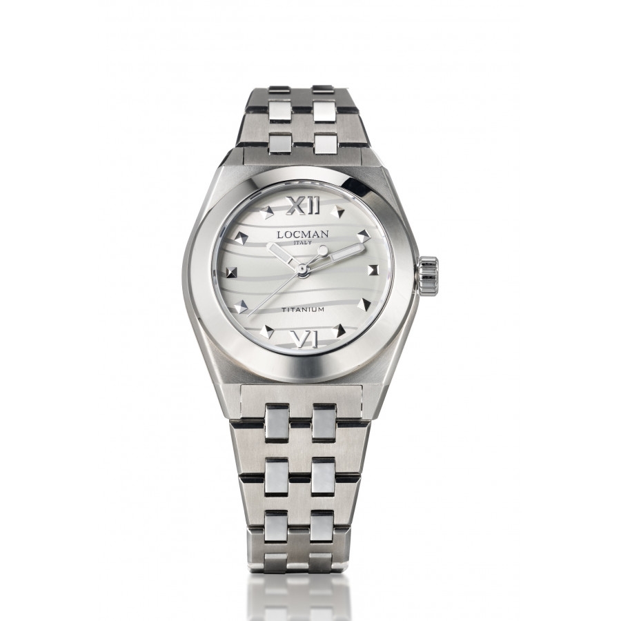 Orologio Locman della linea Stealth Titanio con quadrante argento sunray, cassa da 36mm e bracciale in titanio finitura lucida e satinata, vetro zaffiro, resistente 200mt. movimento quarzo