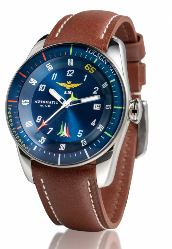 Orologio Locman realizzato in collaborazione con le pattuglia acrobatica Frecce Tricolori in edizione limitata a 650 pz numerati. Versione quadrante blu soleil, cassa in acciaio da 44mm e cinturino pelle marrone. Il movimento automatico visibile dal fondello è modificato dal SIO, Scuola Italiana Orologeria. Il quadrante presenta tutti i simboli delle Frecce Tricolori, dalla strumentazione di bordo degli aerei di quegli anni, alla lancetta dei secondi a forma di freccia Tricolore, il numero 65, a celebrare la 65sima stagione acrobatica. Al 12 campeggia l’Aquila Turrita, simbolo di tutti i piloti dell’Aeronautica Militare, e al 6 troviamo il logo della Pattuglia con le Tre Frecce. La cassa è resistente fino a 100mt ed è impreziosita da un vetro zaffiro mentre il fondello riporta la numerazione della serie limitata e l'oblò, in vetro minerale, ha serigrafato il famoso logo delle Frecce Tricolori. Cinturino in pelle marrone con impunture a contrasto e chiusura a fibbia.