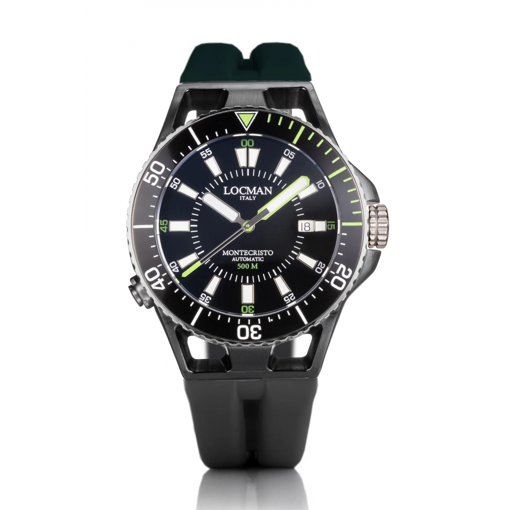 Locman Montecristo diver 500 mt automatico da uomo un'orologio subacqueo senza compromessi con valvola dell'elio e ghiera in ceramica, quadrante nero e finiture verdi. Cassa da 41mm, esclusa corona, in acciaio trattato IP nero. Fondello in titanio e cinturino in silicone nero, vetro zaffiro, impermeabile 50 bar movimento automatico modificato S.I.O.
