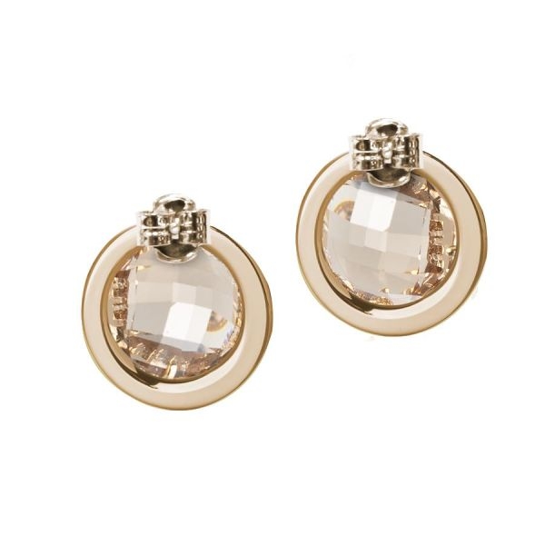 Orecchini a lobo in bronzo placcato oro giallo con cristalli briolette champagne e zirconi. Diametro cm 1,5.