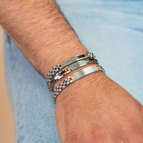 Bracciale modulare in acciaio rodiato con placca centrale liscia e dettagli placcati oro giallo. Chiusura a scatto. Lunghezza regolabile fino a 21 cm.