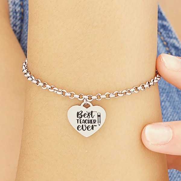 Bracciale in acciaio 316L con pendente a forma di cuore con scritta "Best teacher ever" in smalto nero su fronte e scritta "Grazie maestra per averci aiutato a crescere" in smalto nero su retro.