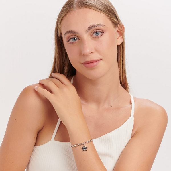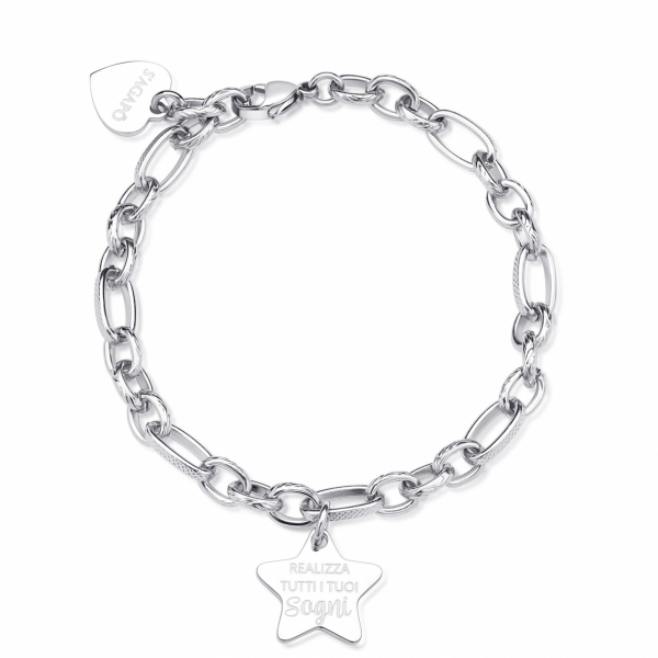 Bracciale catena rolò lavorato in acciaio 316L con pendente a forma di stella con scritta incisa e incisione a tema laurea sul retro.