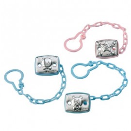Spilla portaciuccio rosa o celeste con placchetta in argento con vari soggetti