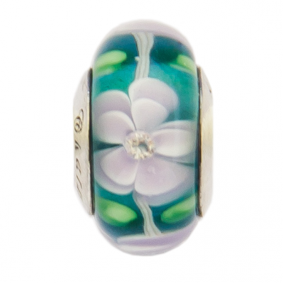 L'abbinamento di materiali, artigianalità e ricercatezza danno vita ad una bead unica nel suo genere, ravvivata da un cristallo swarovski accolto in un involucro di murano trasparente, incrementando l'effetto della tridimensionalità che la contraddistingue.