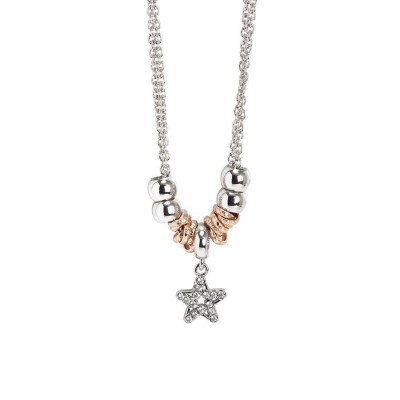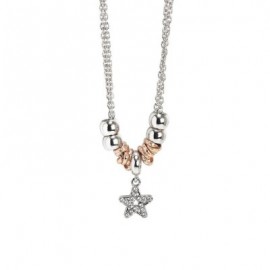 Collana doppio filo in bronzo rodiato con pendente a forma di stella dalla superficie zirconata, magliette codronate placcate oro rosa e sfere lisce rodiate. Lunghezza cm 40, estendibile fino a cm 45.