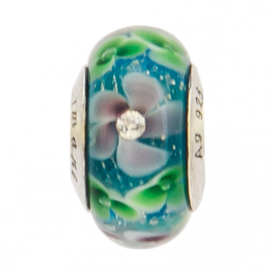 L'abbinamento di materiali, artigianalità e ricercatezza danno vita ad una bead unica nel suo genere, ravvivata da un cristallo swarovski accolto in un involucro di murano trasparente, incrementando l'effetto della tridimensionalità che la contraddistingue.